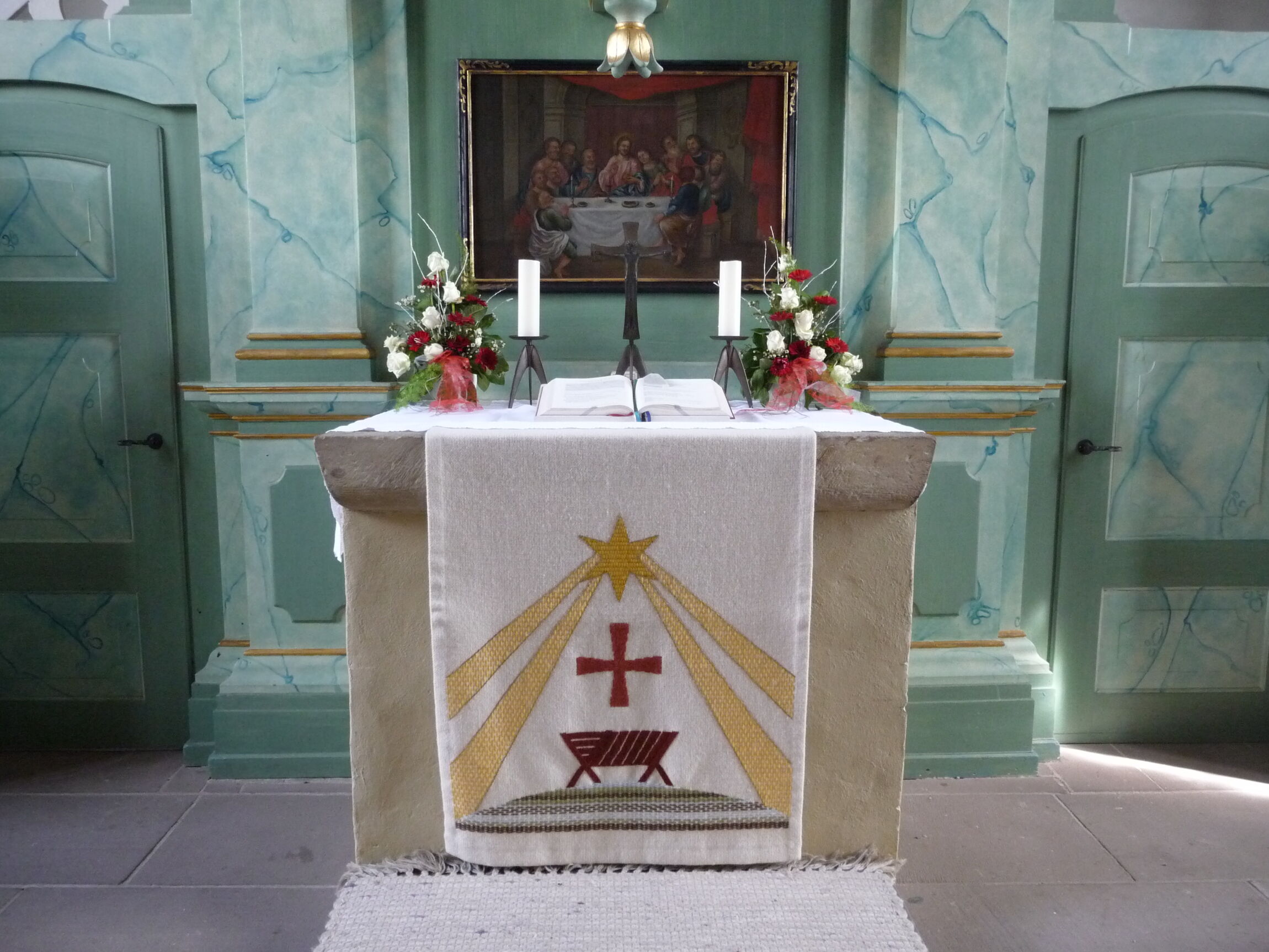 Der Altar ist der Ort, an dem die Gemeinde das Abendmahl feiert. Die Urchristen feierten das Abendmahl auf dem Grab Ihrer Lieben, um ihnen bei dieser heiligen Handlung ganz nahe zu sein und für die Auferstehung zu beten, so wie Christus vom Tode auferstanden ist. Später war es ein heimlich abgehaltenes Sättigungsmahl/Agapemahl. Als im 2./3. Jh. die ersten Kirchen errichtet wurden, diente ein Quaderstein als Altar. In der Zeit des Barock hatte der Altar wieder die Form eines Sarges, wie ich es in Barockkirchen gesehen habe. Danach ging man wieder zum Blockaltar oder auch Tischaltar über.