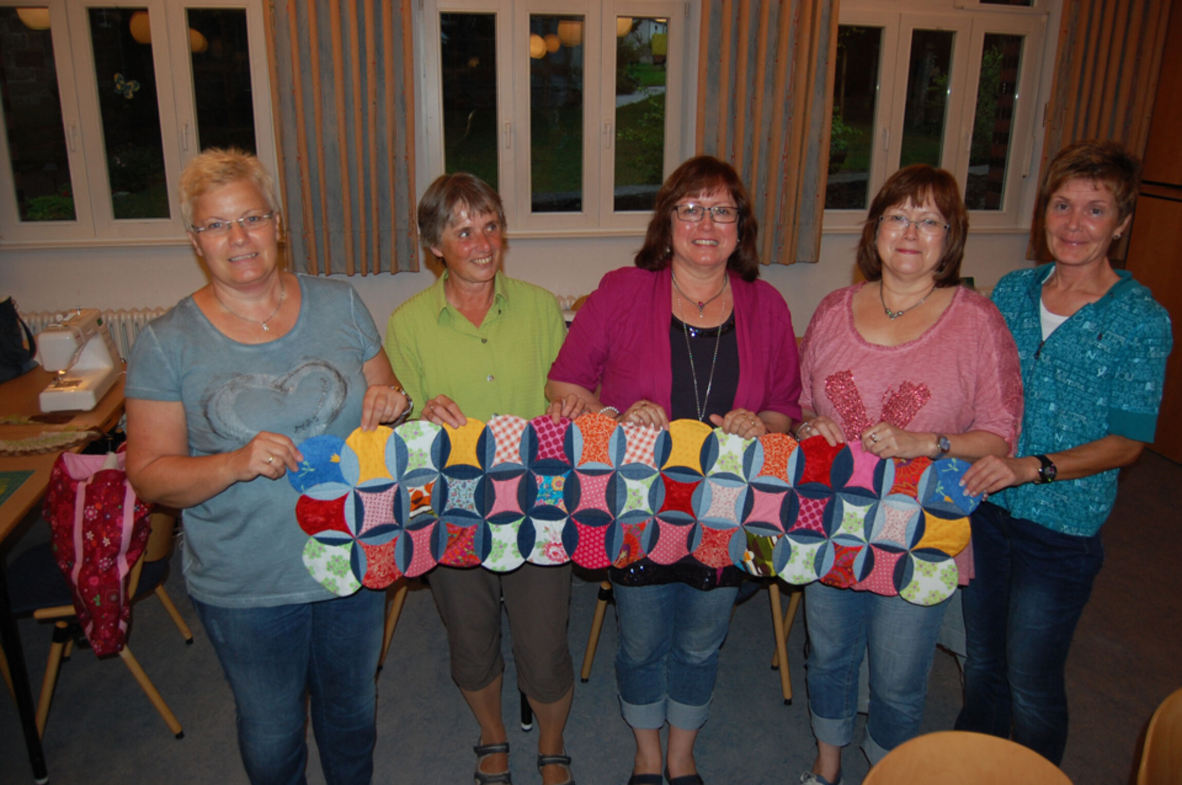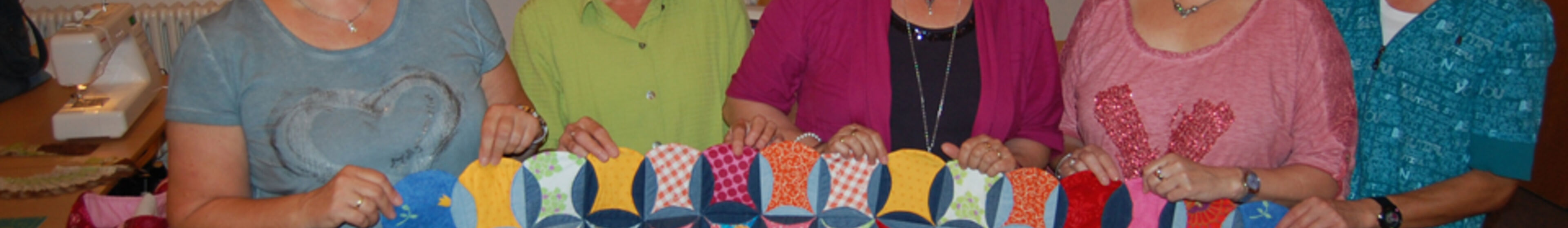 Der Stil, in dem unsere Sitzauflage gefertigt wurde, nennt sich japanische Falttechnik. Eine Pappschablone bildet dafür die Grundform, um die dann der Stoff zum Verarbeiten gelegt wird. Auf dem Foto sind die Gruppenteilnehmerinnen zu sehen, die die Sitzauflage gefertigt haben.